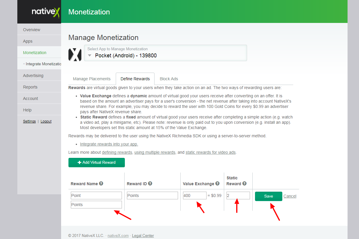 and select your app from dropdown list and click on Define Rewards and add Virtual Reward..