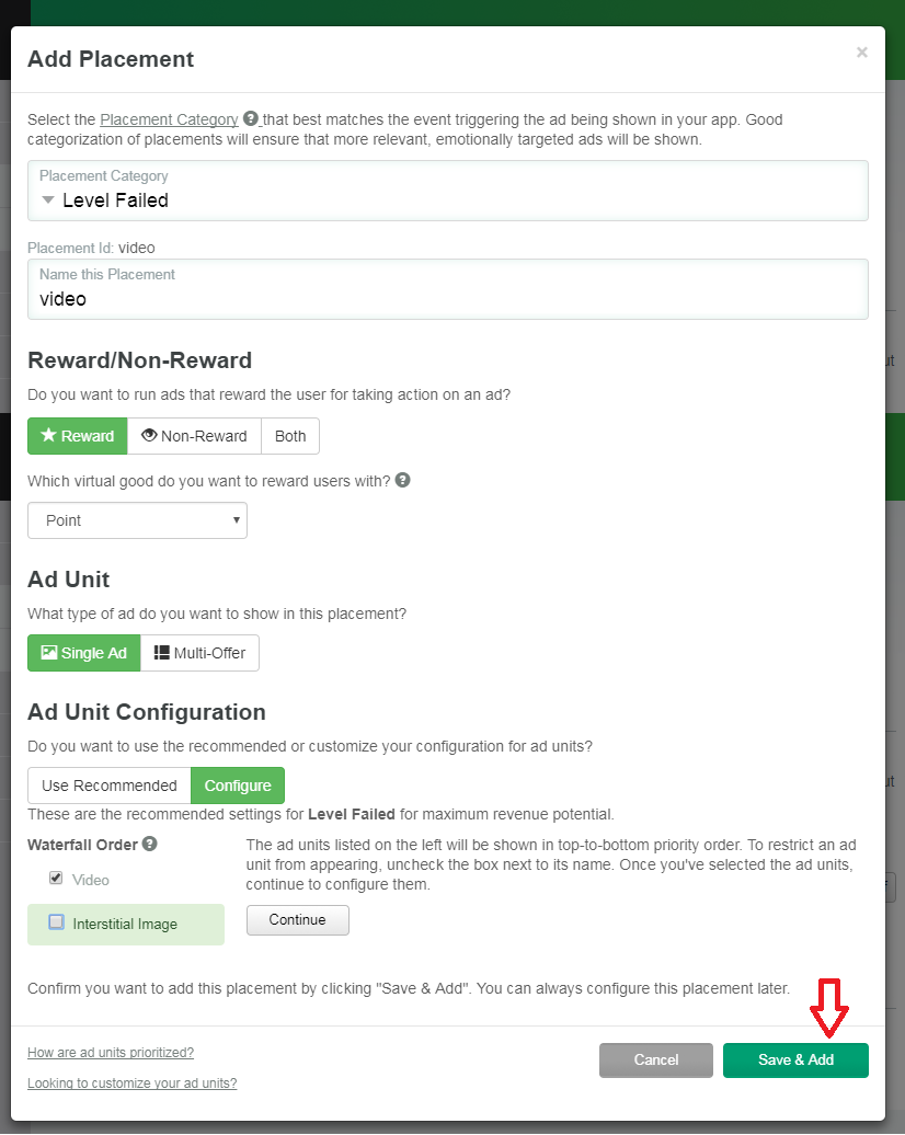 After saving your virtual rewards, click on Manage Placements tab, and add a new placement